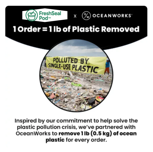 🌊 Every Order Helps Clean Our OceansSingle-use plastic is one of the biggest threats to our planet — polluting oceans, harming marine life, and even making its way into our food. FreshSeal Pod™ doesn’t just reduce future plastic waste in your home… it also helps remove plastic that’s already out there.For every FreshSeal Pod™ order, a portion of your purchase supports global cleanup efforts working to remove plastic waste from oceans and waterways.Your kitchen upgrade now has a larger purpose.